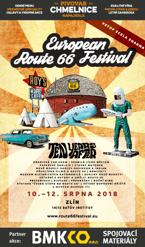 BMKco s.r.o. je partnerem II. evropského festivalu, jenž je věnovaný americké silnici Route 66. Festival se bude konat od 10. do 12. srpna v prostorách Baťova institutu. K vidění bude velice zajímavý program, který bude okořeněn americkou car show. Těšte se na unikátní harleje i s nejnovějšími modely, čtyřkolky, bugatky, stavby motorek, muzeum historických automobilů, repliky vozů Bugatti a další. Program bude okořeněn pravou americkou car show. Naplánováno je i noční promítání doplněné o zajímavé besedy a přednášky, setkání s autory Route 66. Do Zlína přijede i světová rocková legenda Ten Years After, účastník Woodstocku v roce 1969. Zajímavá bude i spanilá jízda městem od 14|15 Baťova institutu. Vstup na festival je pro všechny návštěvníky zdarma. Doporučujeme se zastavit i u jednoho ze tří stánků, kde bude Pivovar Chmelnice